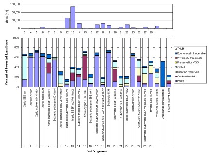 Using a combination of GIS data processing and FSOS modelling, the proportion of each ecosystem unit reserved from harvest is examined, to ensure that a full range of ecosystem types is represented across the NHLB. Ecosystem representation data is then used to determine the effectiveness of the NHLB in reducing ecological risk, which is dependent on the quality of ecosystem representation. Knowledge of the degree of risk for certain areas of the land base can assist forest managers in planning and identifying priority areas for biodiversity management.